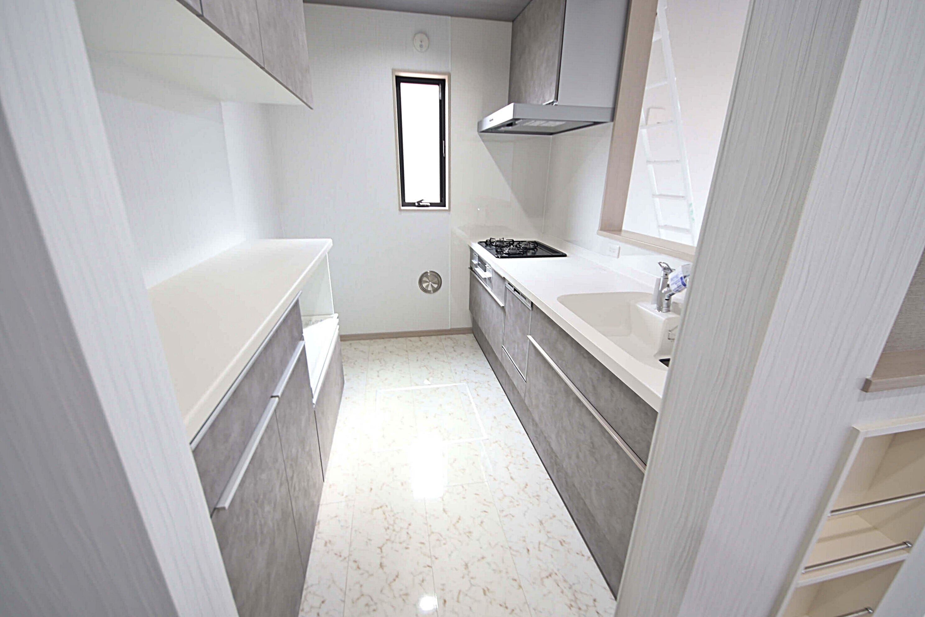 人造大理石カウンター、浄水器一体水栓のシステムキッチンです
