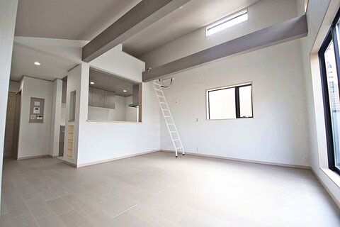 2階LDは勾配天井につき陽当たり開放感良好!寒い冬でもあたたかく過ごせる床暖房付き
