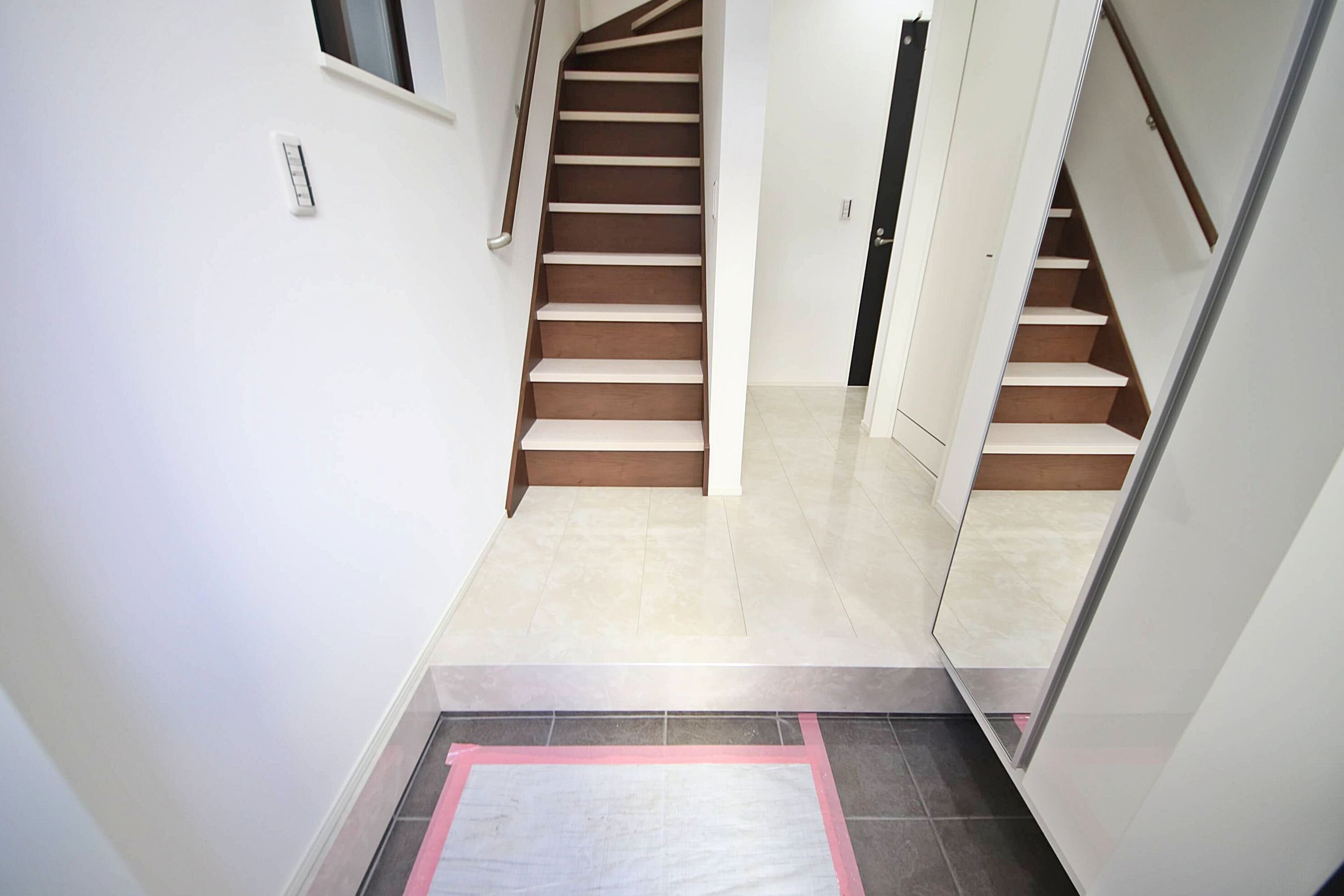 全身が映る鏡やトールタイプのシューズボックスを備えた玄関