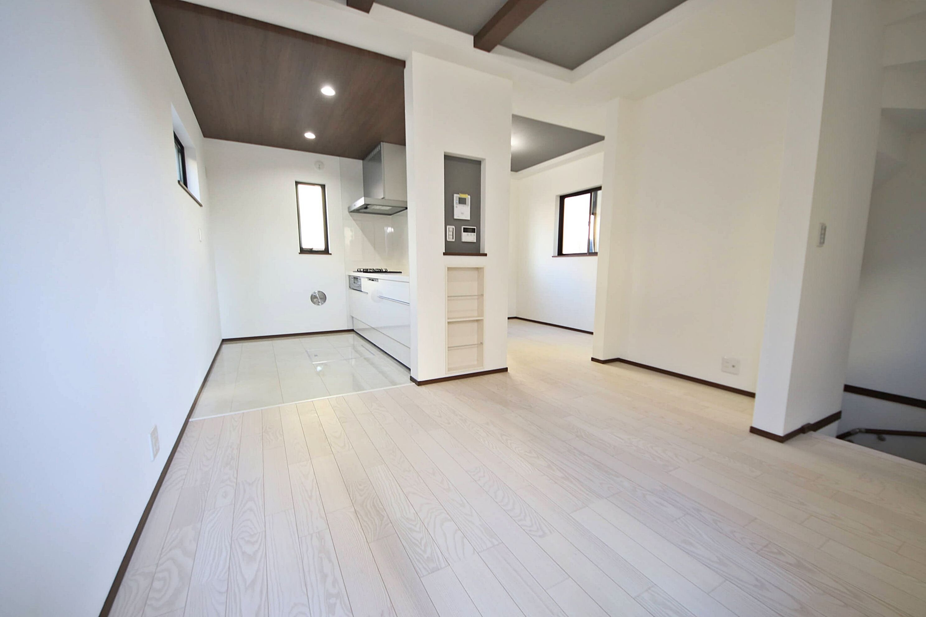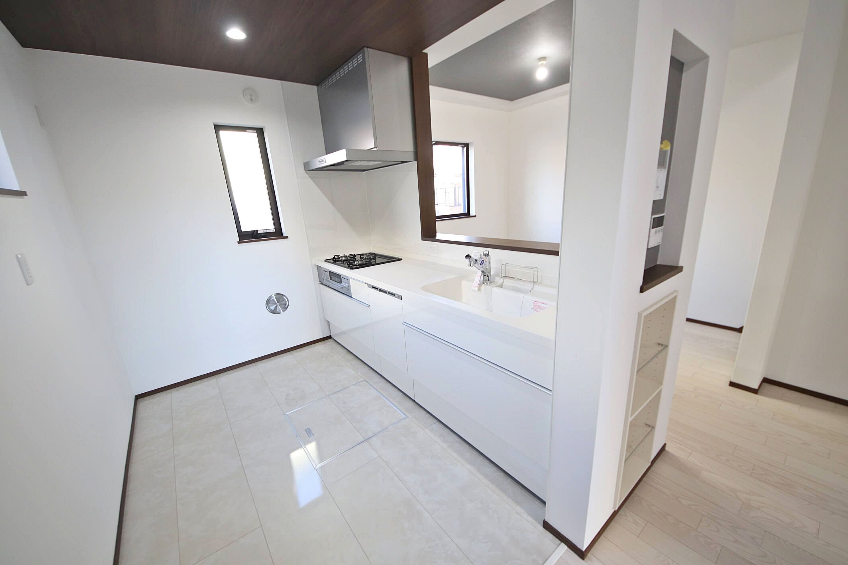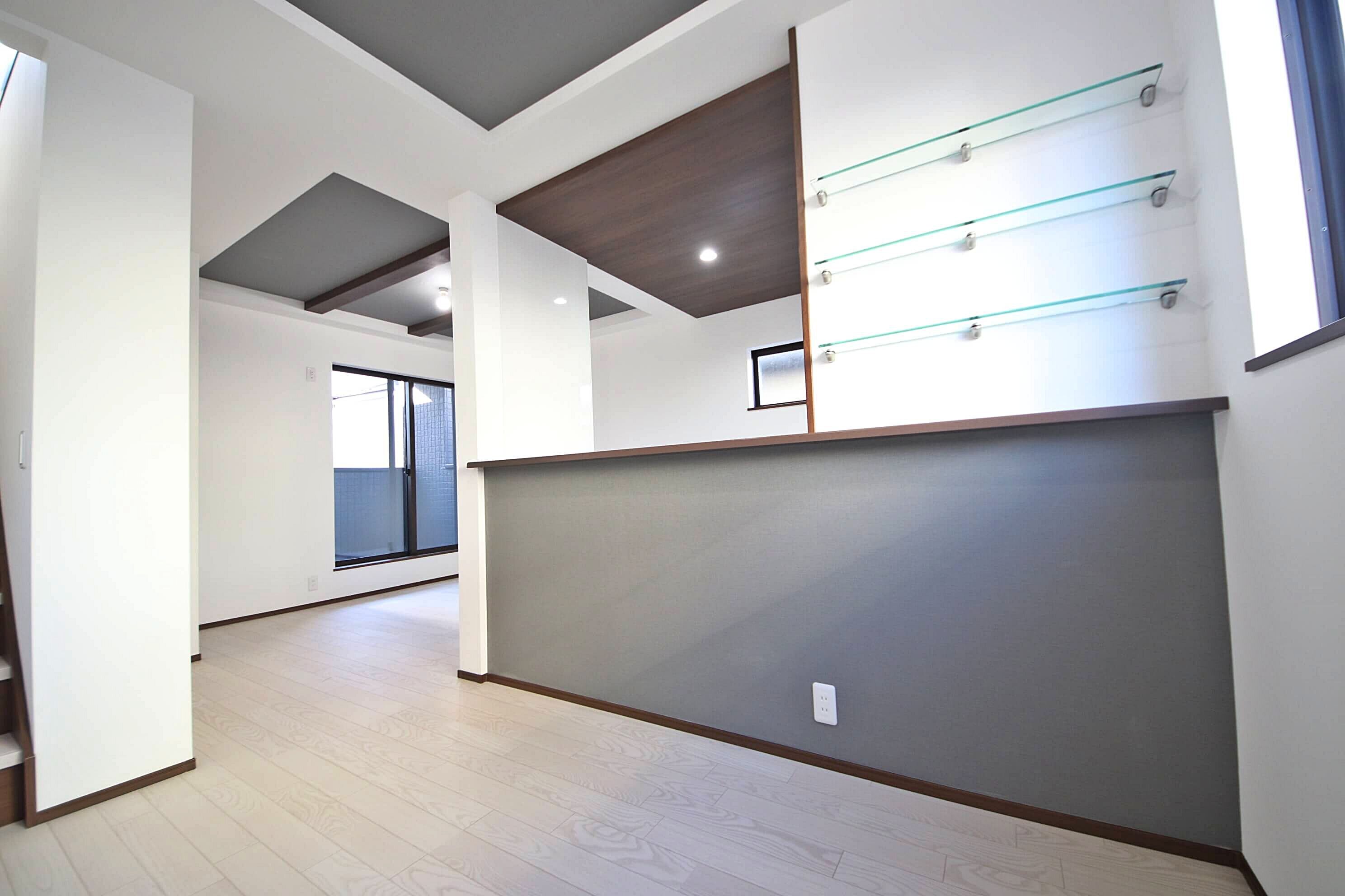 リビングの折上げ天井、キッチンの折下げ天井、ガラス棚、カウンター下部のアクセントクロス等すべて標準仕様