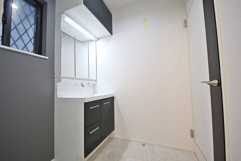 洗面所の床は大理石調床材でお掃除しやすいと好評です