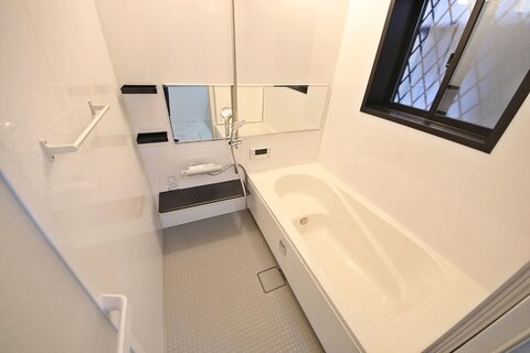 雨の日でも洗濯物を乾かせる浴室乾燥機を備えたバスルーム
