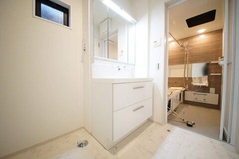 <2号棟 洗面台>三面鏡や収納等、必要な機能をシンプルにまとめた洗面台