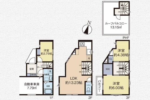 3階建て3LDK、13.15㎡の開放感あるルーフバルコニーが嬉しいポイント