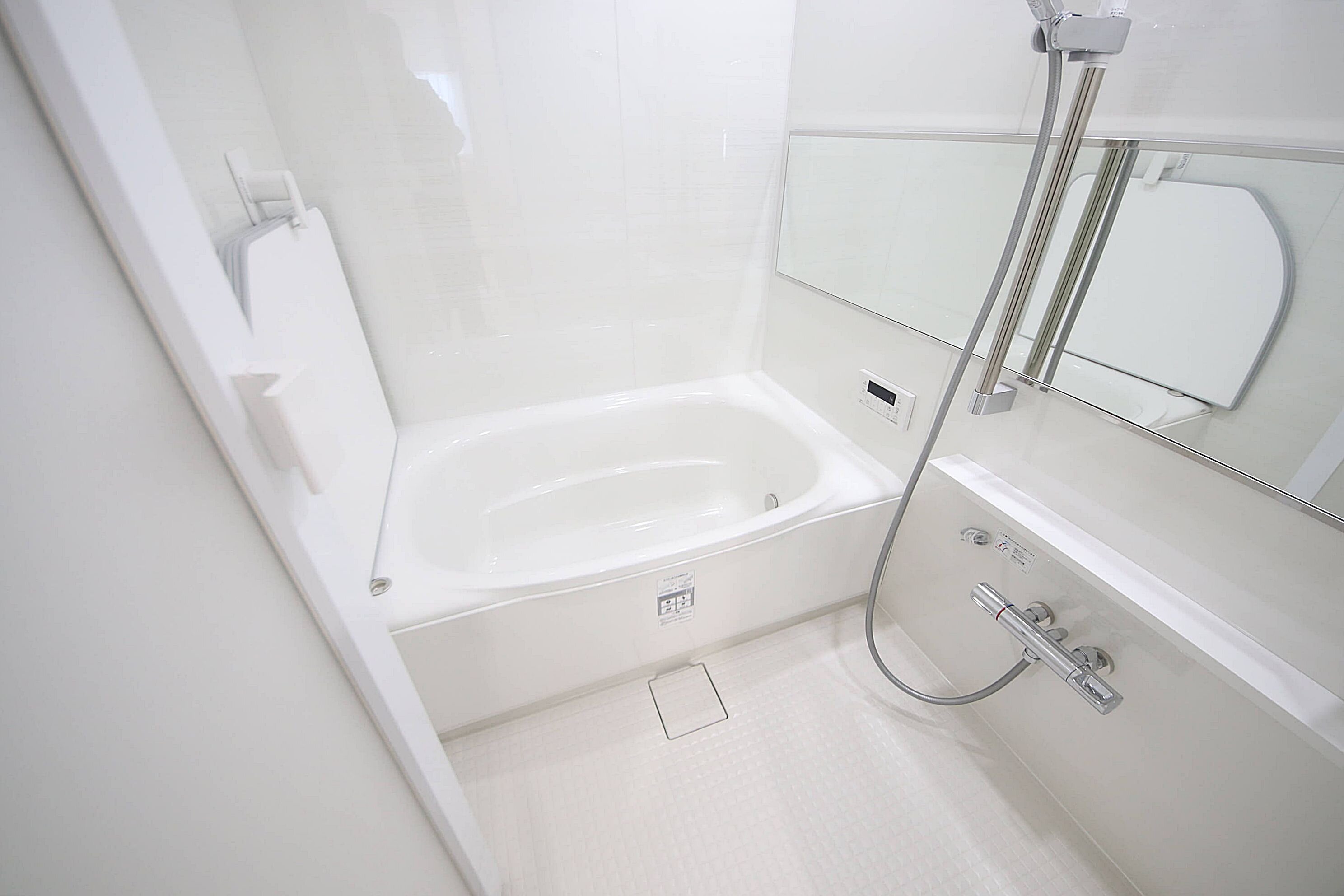 追い焚き機能が付いた経済的なシステムバス、鏡付きで高級感と開放感を演出
