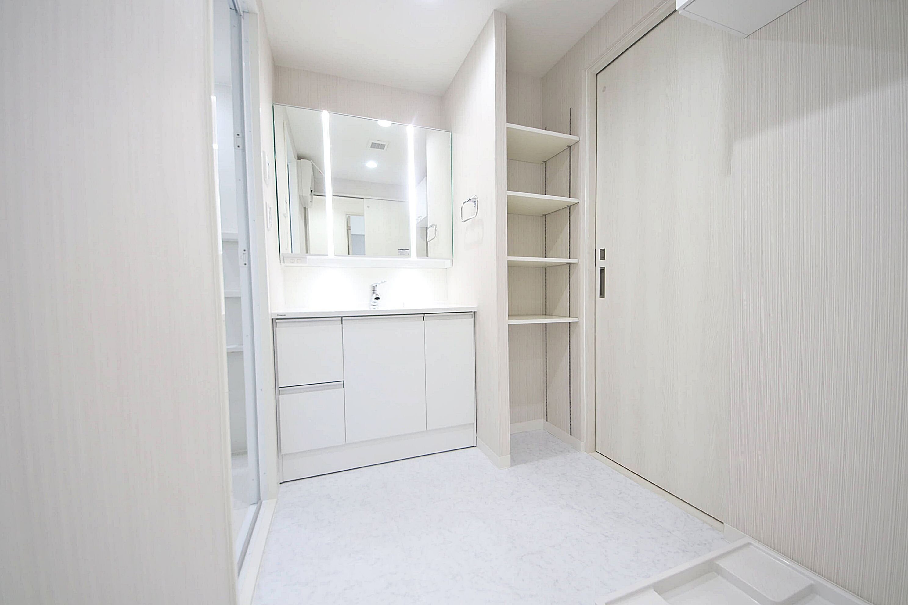 白を基調とした清潔感ある洗面台や着替えやタオルを置ける収納が便利な洗面室