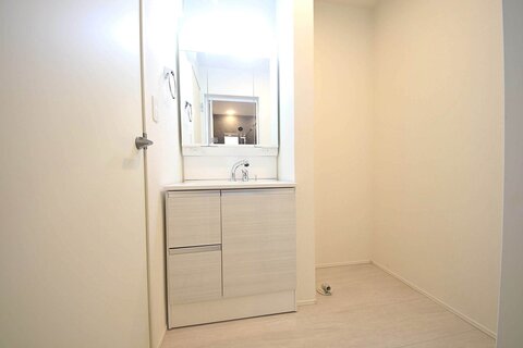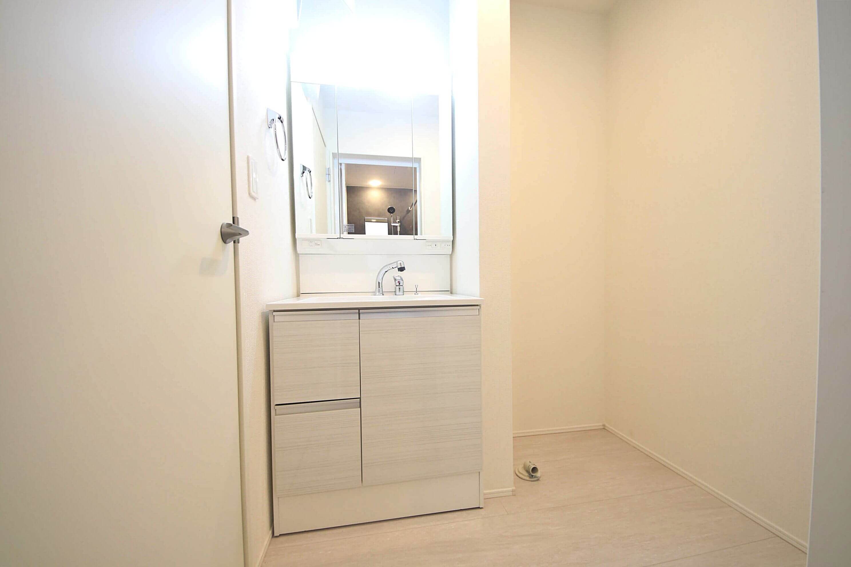白を基調とした清潔感ある洗面台、シャワー型ヘッド水栓仕様ですので、お掃除にも便利です